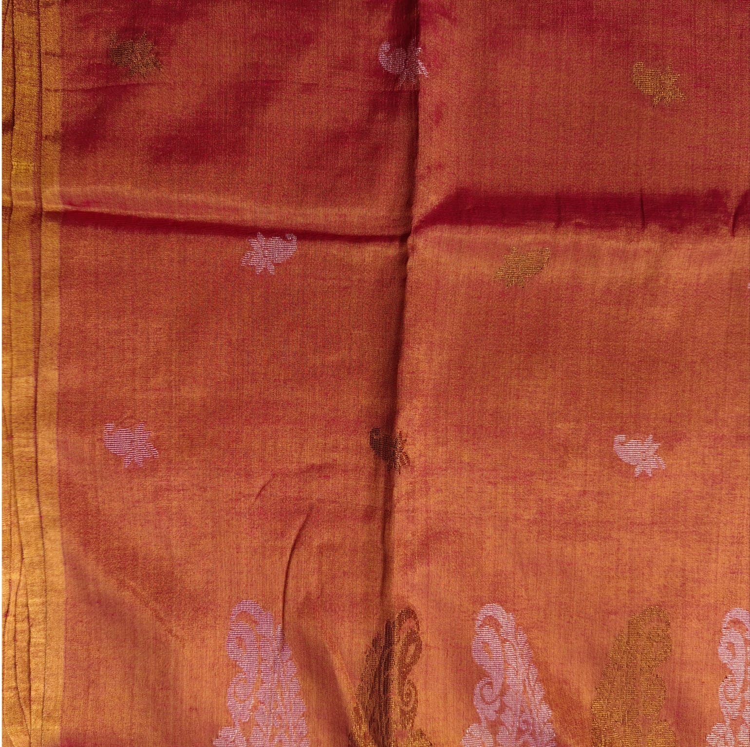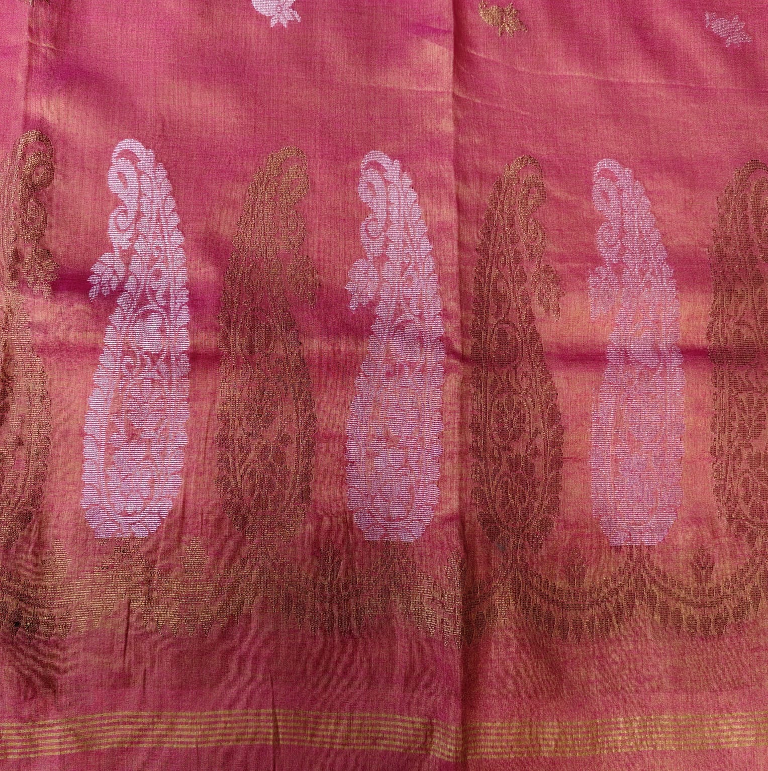 This exquisite dual-shade pink Pure Tissue Linen saree is handwoven with a lustrous, rich texture that radiates elegance. The body carries a beautiful play of pink tones, creating a soft dual-shaded effect with a natural golden sheen. Intricate paisley motifs in golden and silver threads are woven gracefully all over the body, while larger paisley designs adorn the anchal. The sleek zari border and zari selvedge subtly enhance the shimmering anchal, lending the saree an understated yet regal charm. -