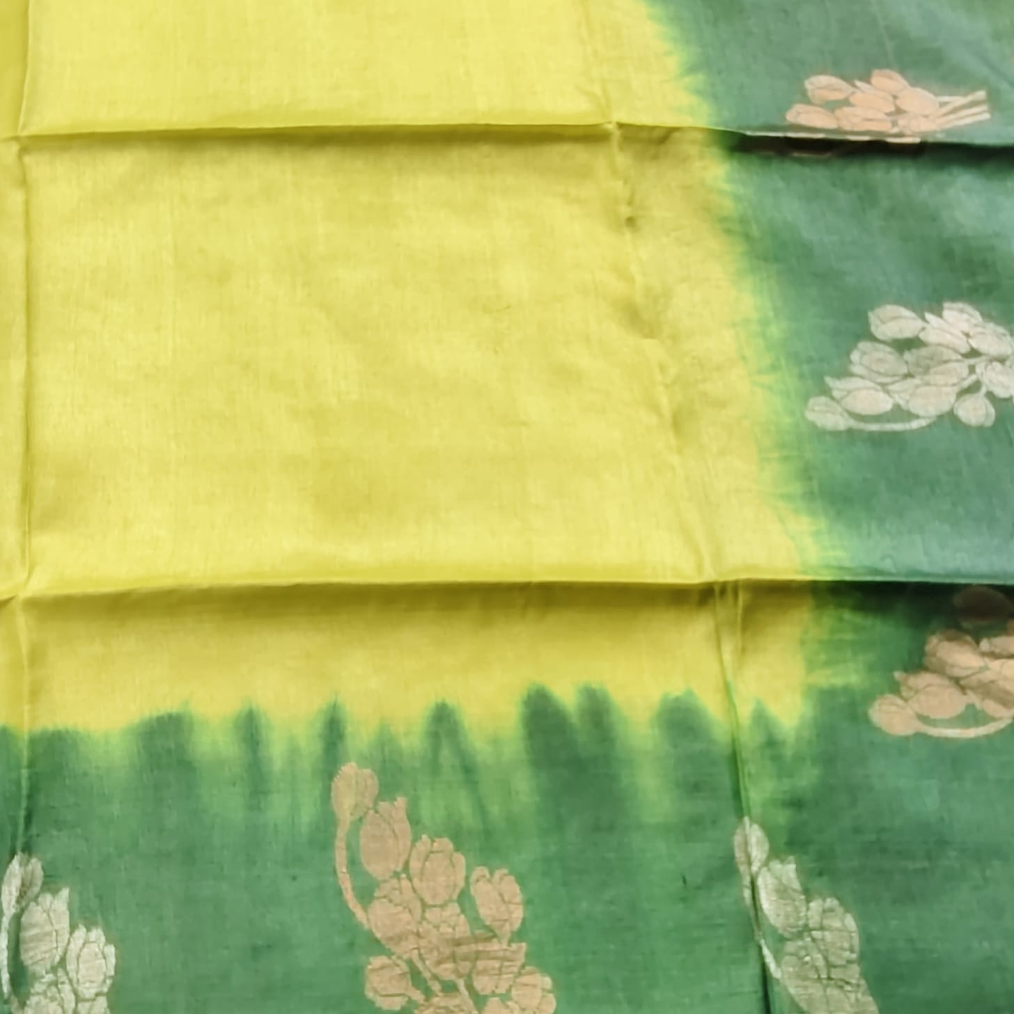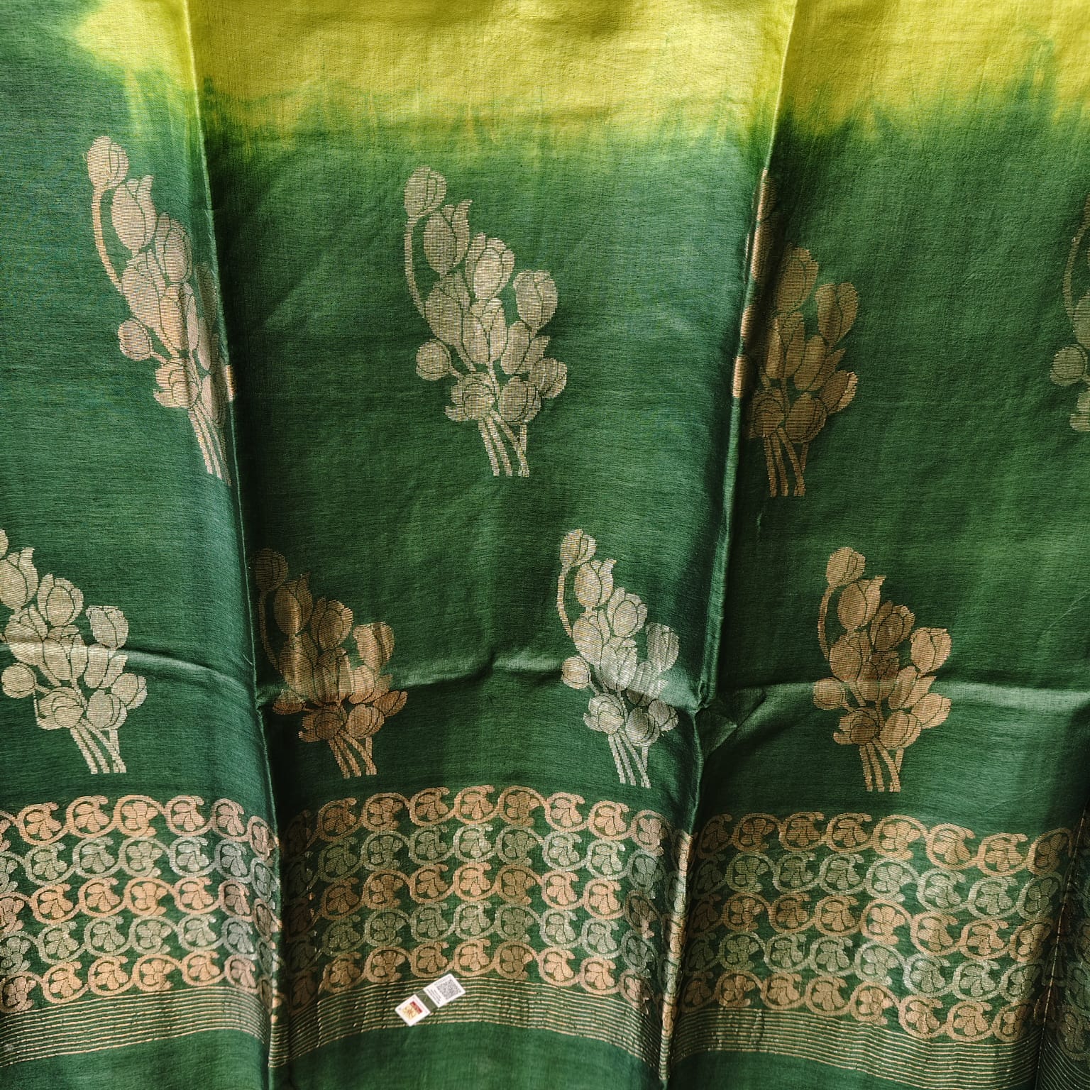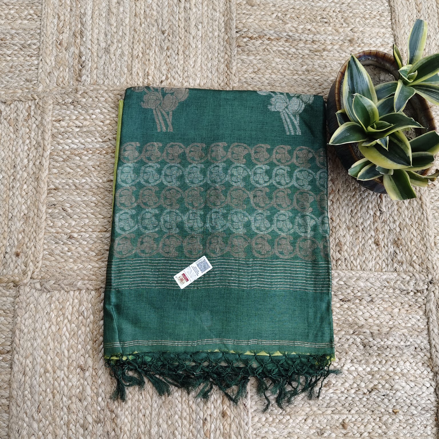 Fabric, Work & Design: Silk Mark Certified & Handwoven Gachi by Gachi Tussar silk saree in a vibrant lime green body, featuring a plain design that beautifully contrasts with the antique zari-woven rich bottle green border. Exquisitely crafted from the finest tussar silk, this saree exudes sophistication, elegance, and a timeless luxurious appeal.