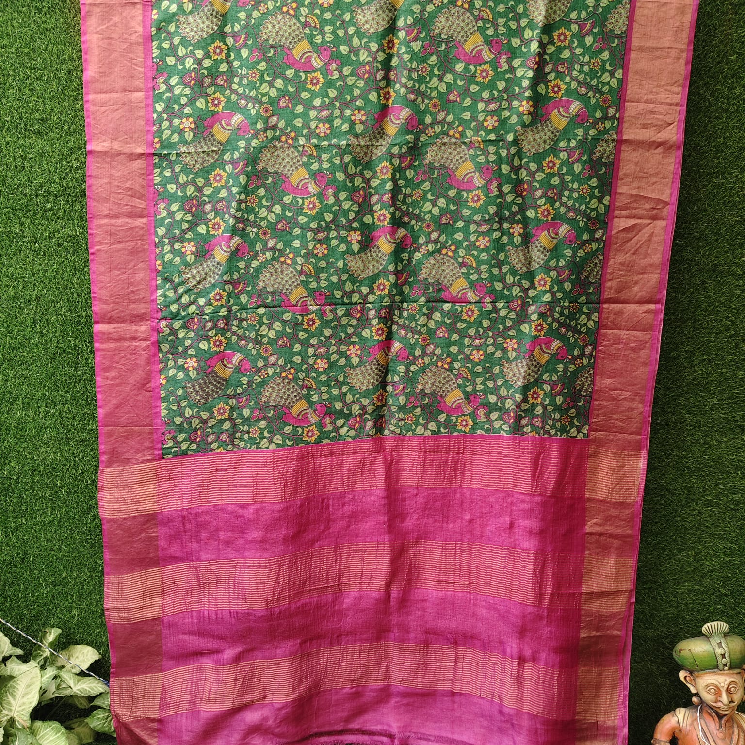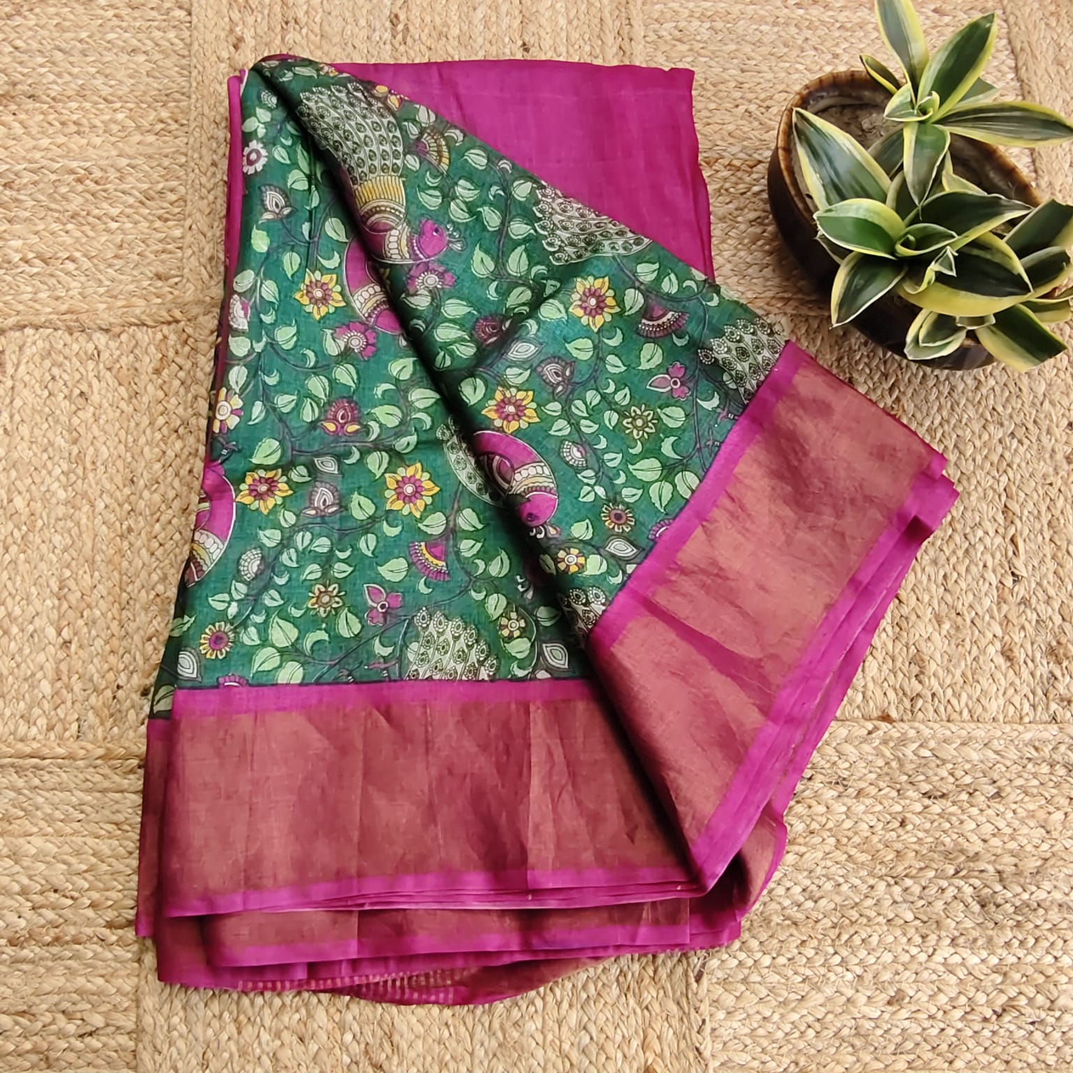 Fabric, Work & Design: Silk Mark Certified pure tussar silk saree in a rich bottle green body, adorned with striking magenta contrast border, pallu, and blouse piece. Features intricate Kalamkari screen printing all over the body, enhanced with zari stripes on the pallu and a zari-woven border, creating a luxurious and sophisticated look.