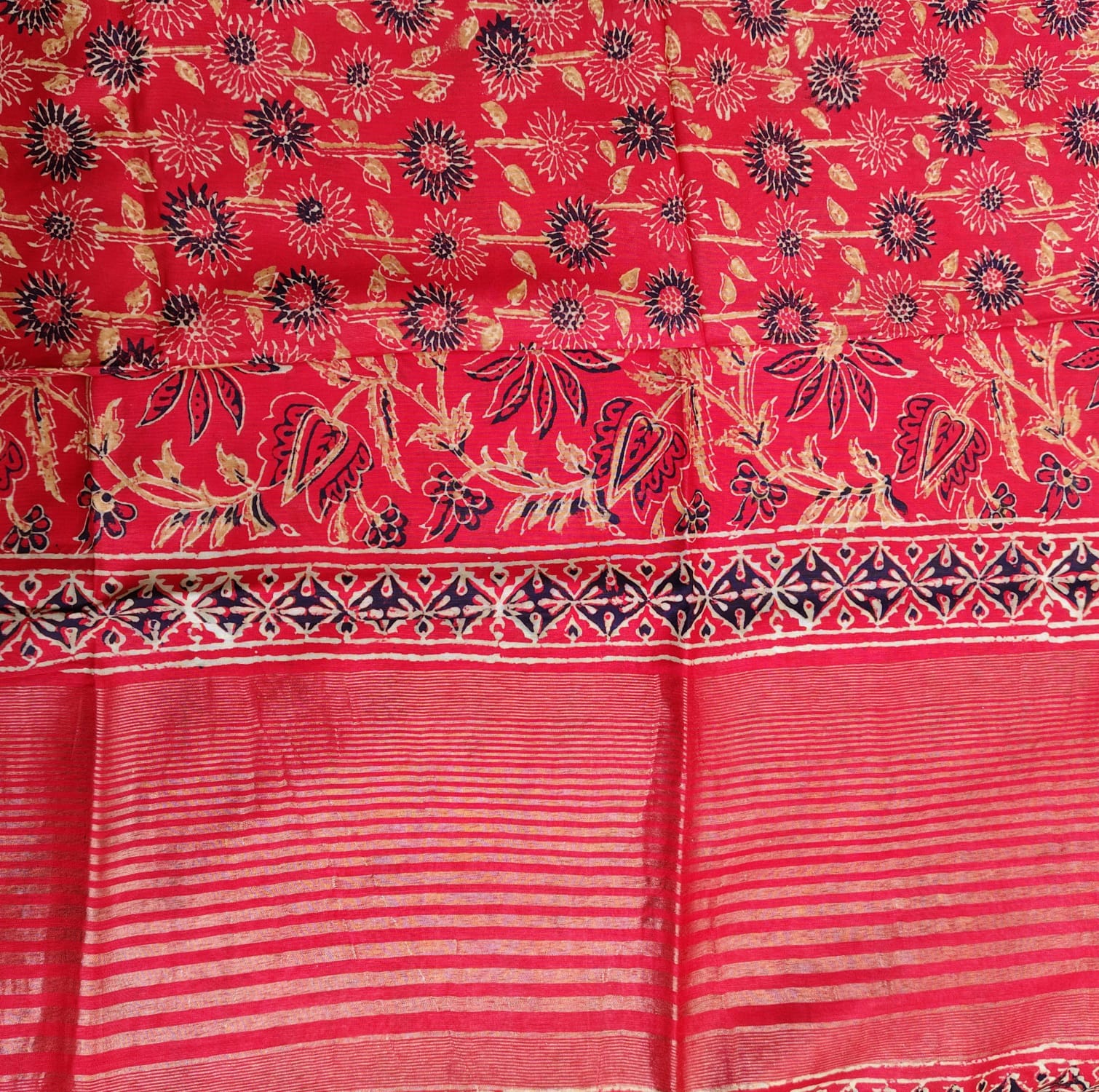 Fabric, Work & Design: Maheshwari silk saree in a vibrant red shade, featuring bold Ajrakh prints, a sleek zari border, and elegant zari stripes on the pallu that enhance its richness. Lightweight with a graceful drape, combining traditional artistry with contemporary appeal.