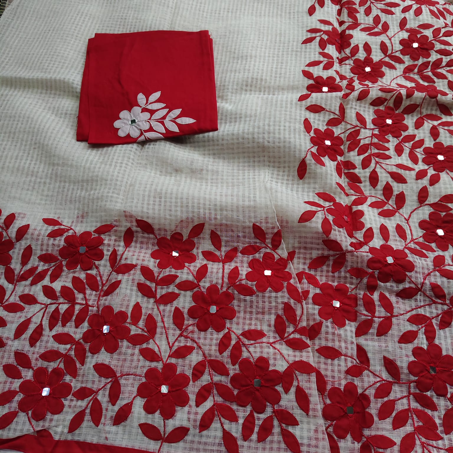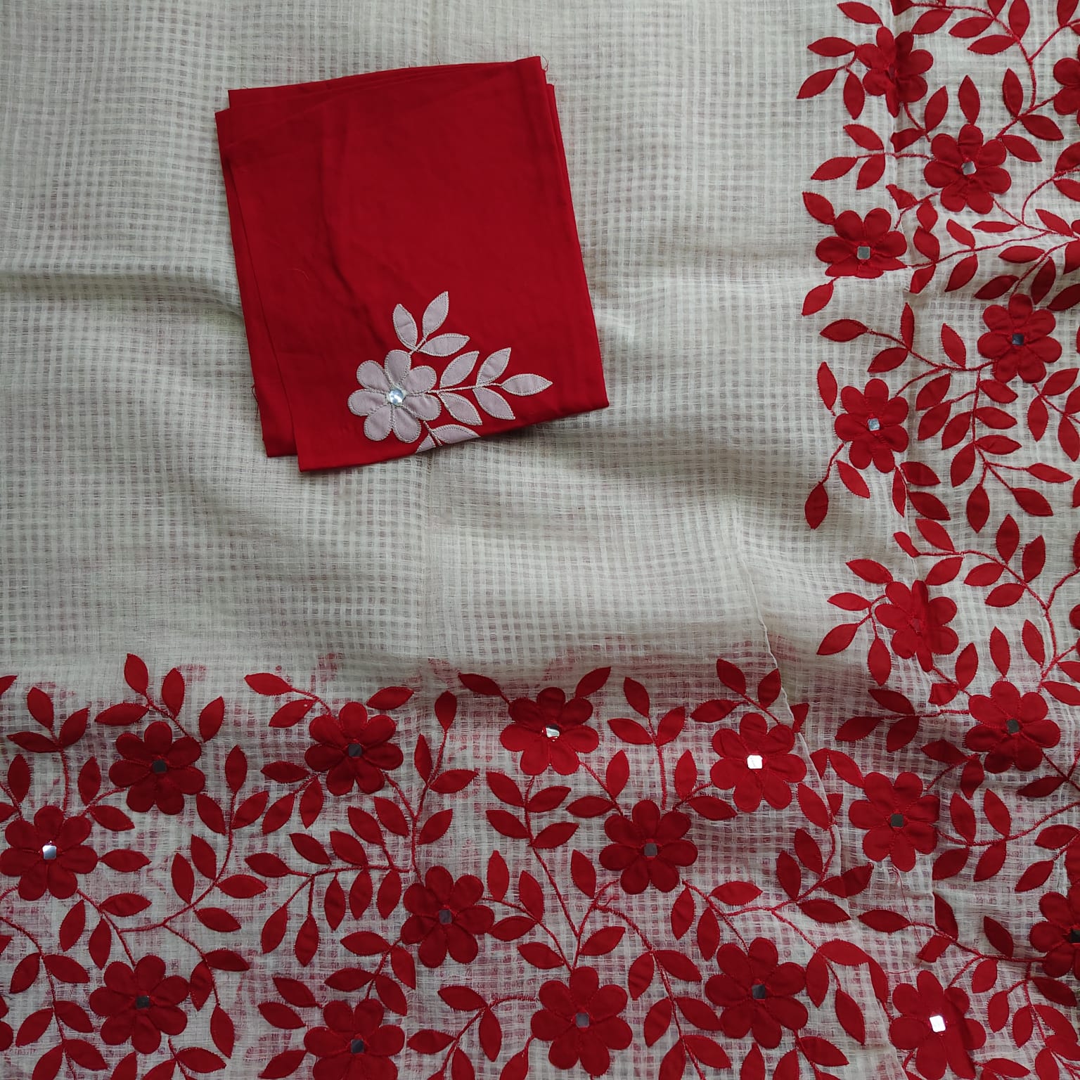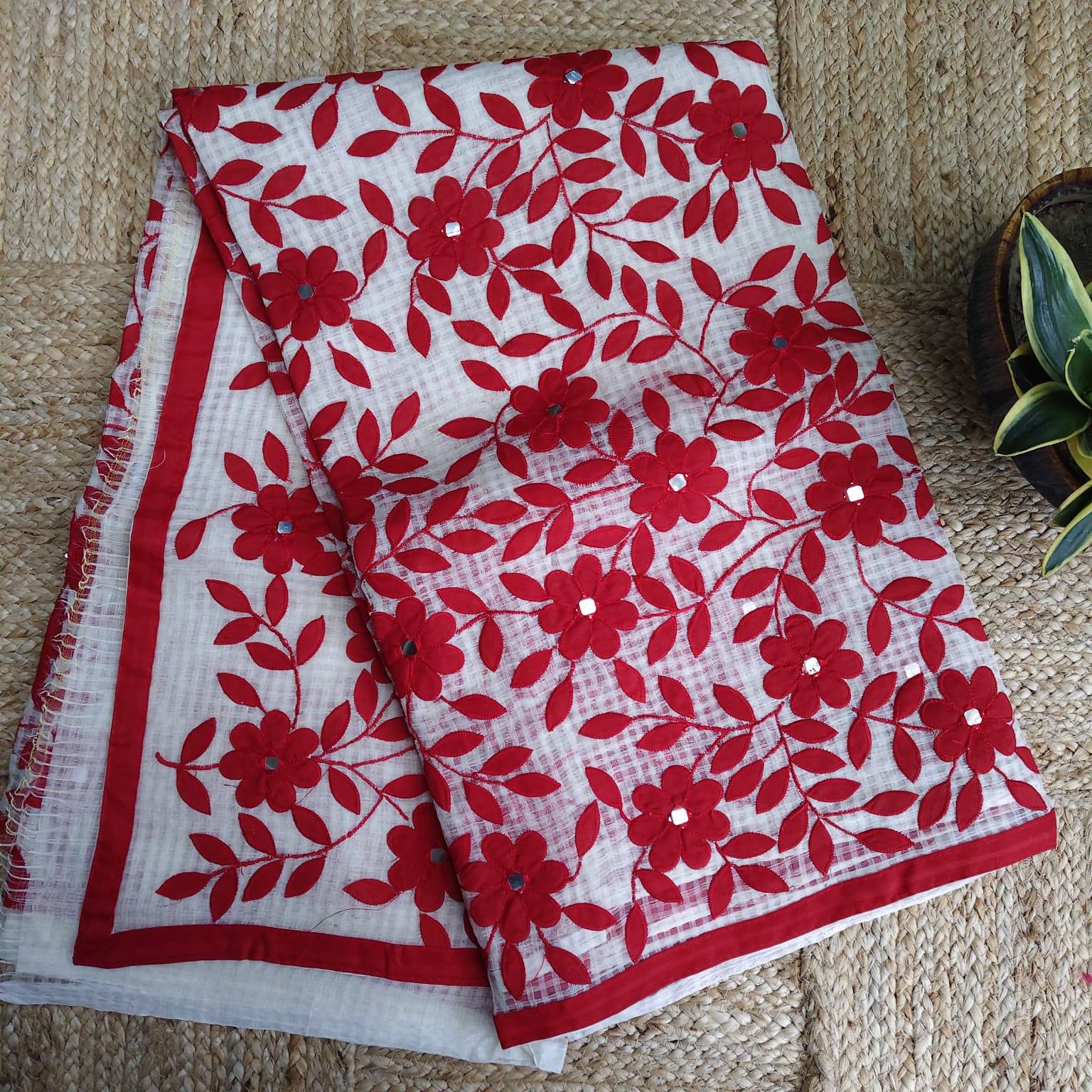 A classic white Resham Kota Saree, beautifully enhanced with appliqué floral jaal work in vibrant red. The applique flowers spread across the saree give it a festive and graceful appeal. The lightweight Resham Kota fabric adds to its comfort while keeping the look elegant. -