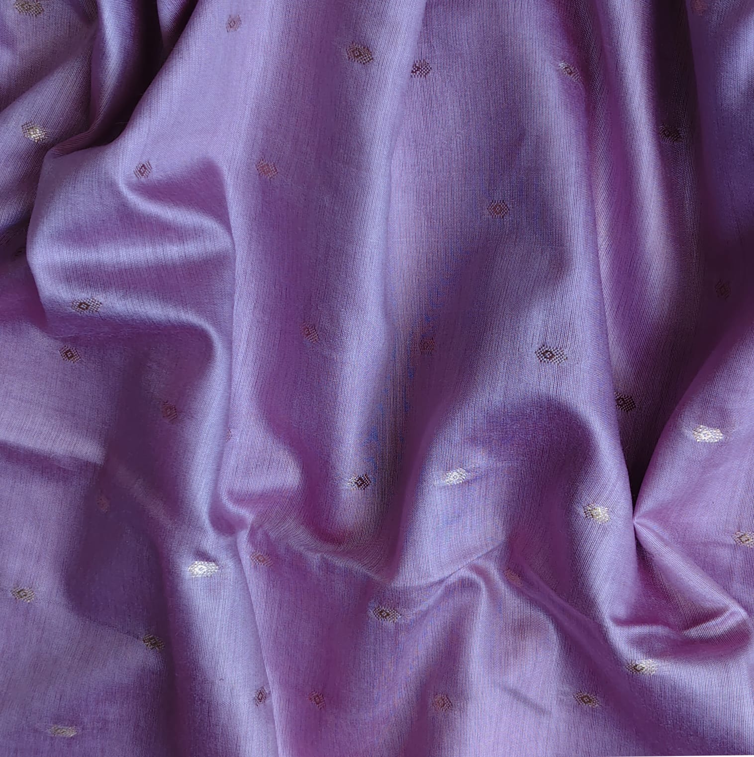 A graceful blended tussar silk saree in an elegant mauve hue, adorned with intricate zari booties woven all over the body. The saree features a broad zari border on the lower edge and a narrower one on the upper side, adding a touch of regal charm. The anchal is beautifully detailed with zari linings, and it comes with a matching running blouse piece. The fabric is soft, smooth, and drapes effortlessly.