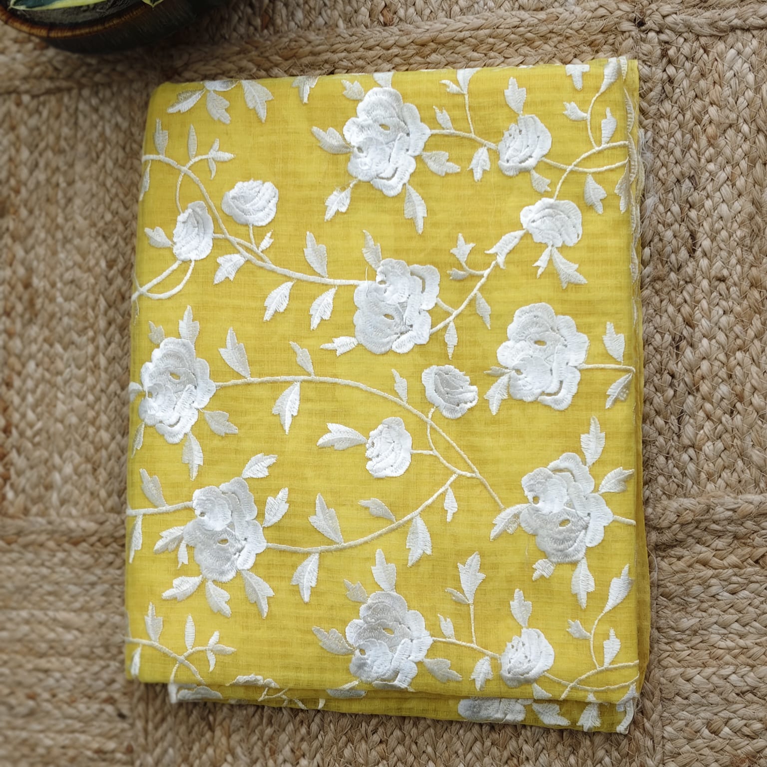A vibrant bright yellow Resham Kota Saree, intricately adorned with manual machine embroidery in white resham thread. The saree features an all-over floral rose jaal pattern, giving it a rich and graceful appeal. Its delicate embroidery and lightweight fabric make it both elegant and comfortable. -